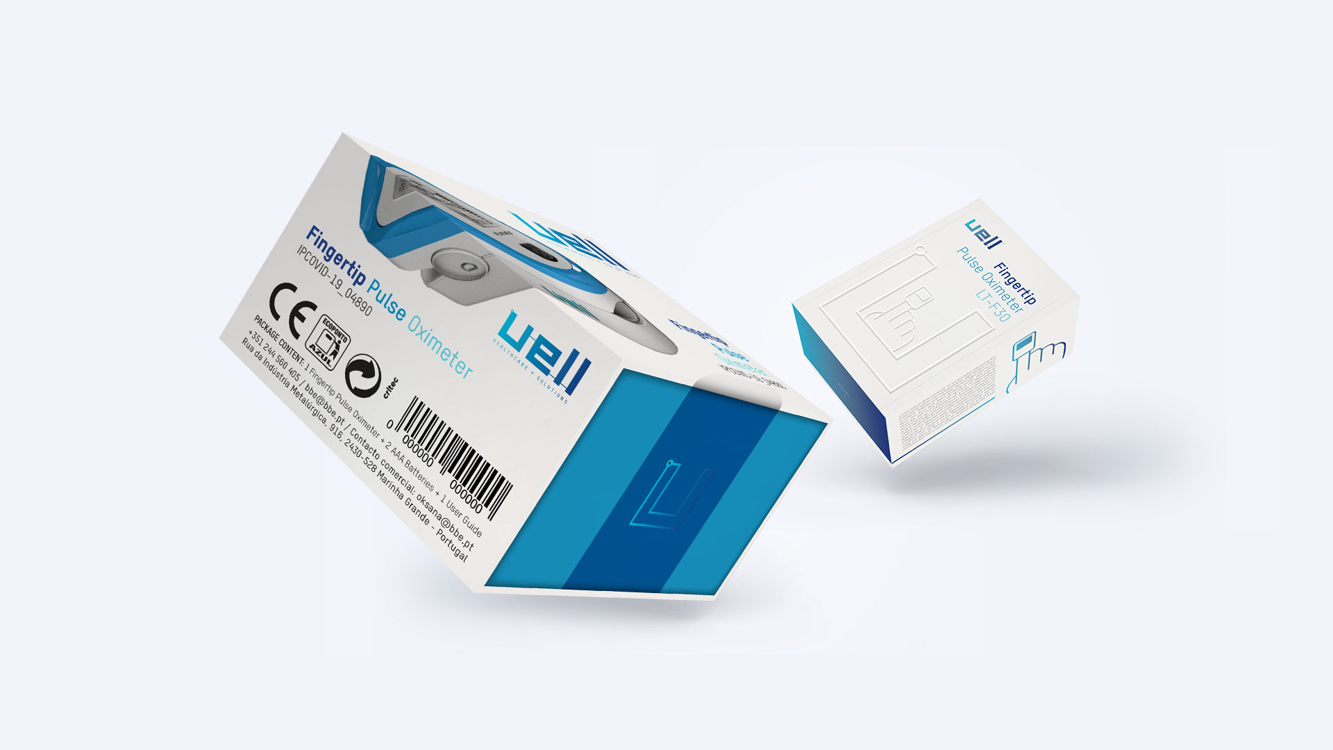 Os oxímetros Uell  —  Fingertip Pulse Oximeter, disponíveis em duas modalidades, estão protegidos numa caixa de cartão desehada à medida. Com um grafismo alinhado com a identidade desta marca de soluções para a saúde, o layout deste projeto possui duas cromáticas para dois tipo de público distintos.